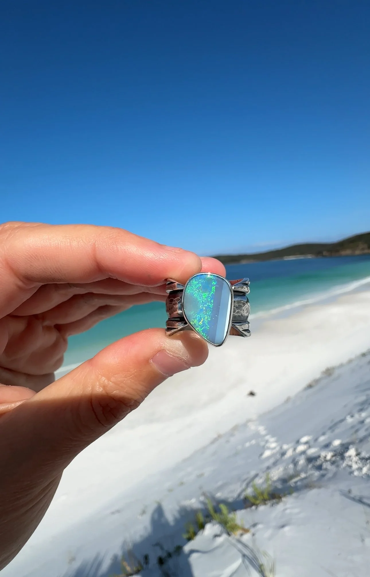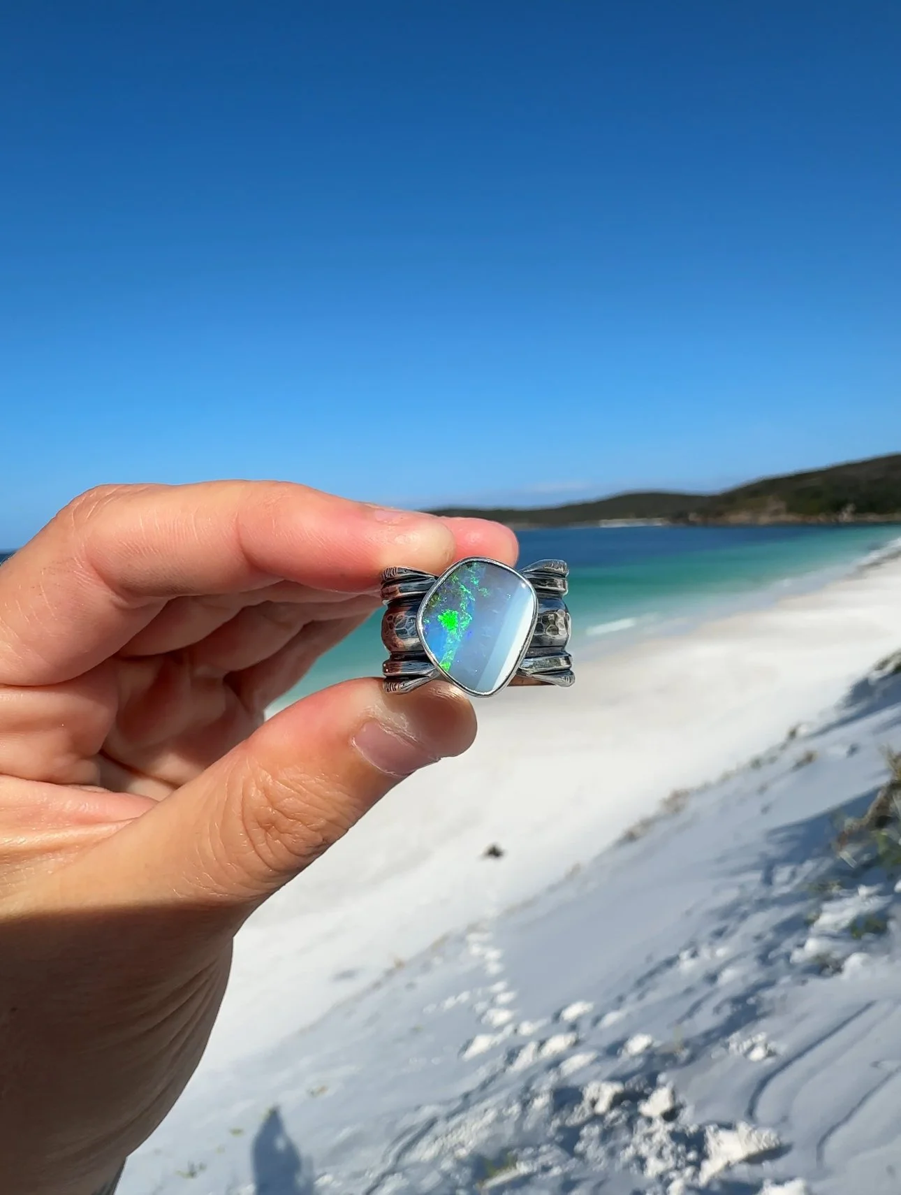 A small, carefully crafted selection of Boulder Opals from Winton, QLD featuring vivid bands of colour. This collection was photographed in Western Australia, where the colours of the opal literally matched the colours of the white sand and ocean. A truly special collection, photographed in an even more special place.